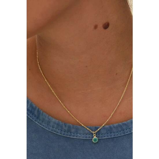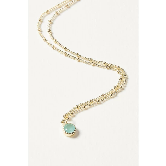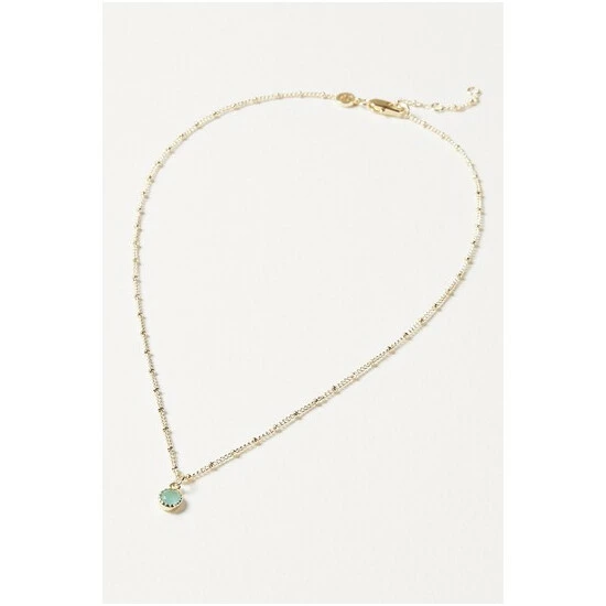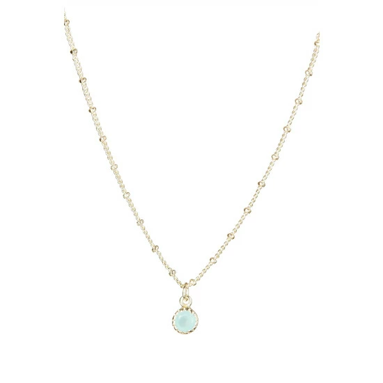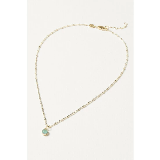 A delicate design, this beaded pendant necklace features a singular blue chalcedony charm set in golden metalware and complete with a lobster clasp fastening.