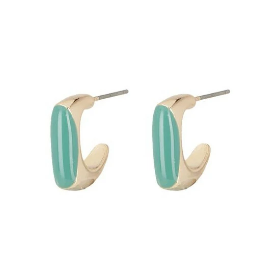 On chunky gold-toned square hoop earrings, a teal inlay is presented, adding a pop of colour.