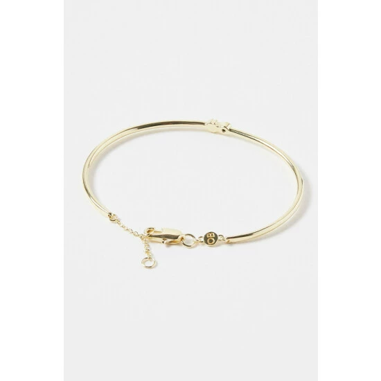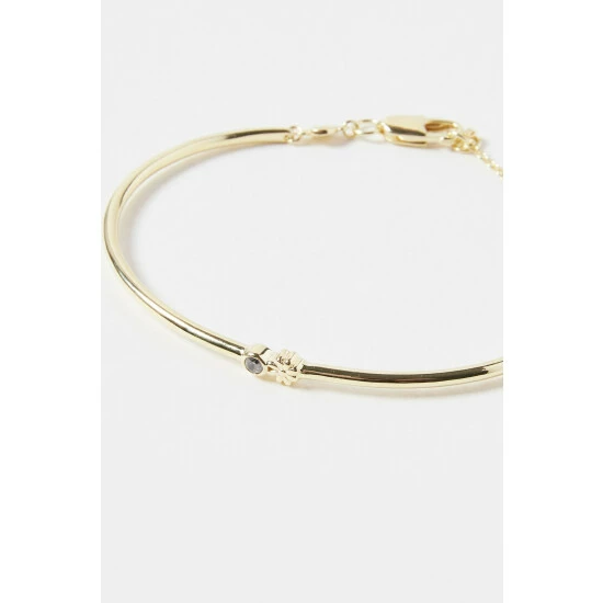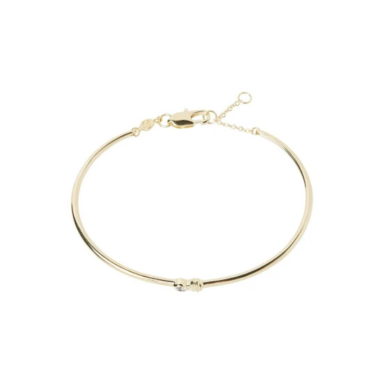 On a delicate gold plated bangle, a small flower sits alongside a clear stone and is complete with an adjustable length and lobster clasp.