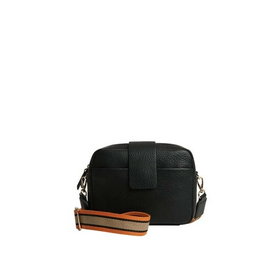 In a rectangular profile, this black cross-body bag contains one lined main compartment and one zipped inner pocket, with an outer slip pocket for your essentials. Featuring a contrasting woven detachable cross-body strap with gold-toned hardware, this bag is completed with a zip fastening and a foldover flap.