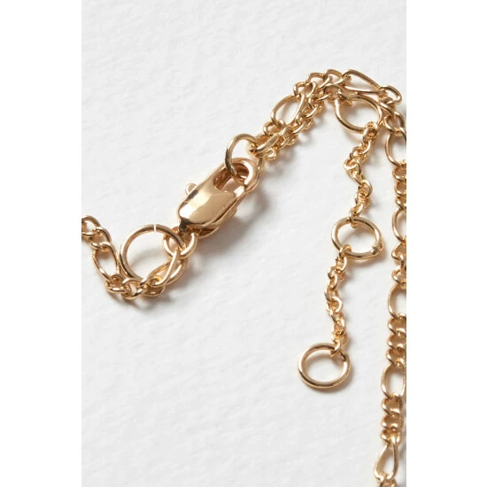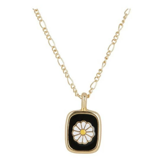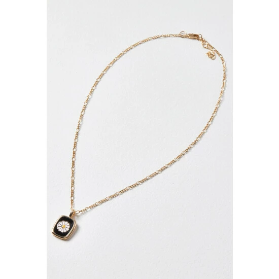 This gold-toned necklace features a fancy chain and a black enamel pendant with a daisy motif, complete with an extendable chain and a lobster clasp.