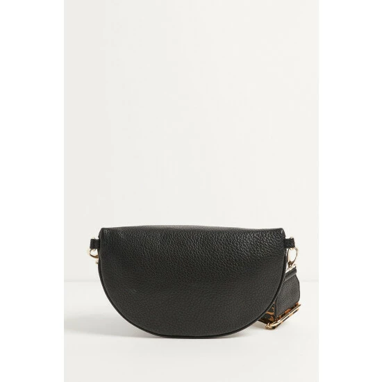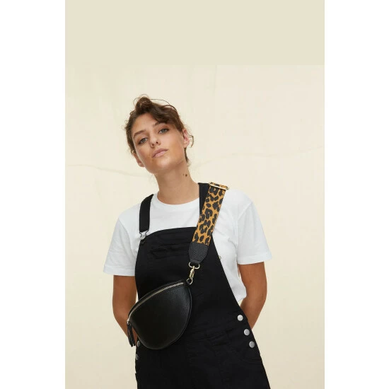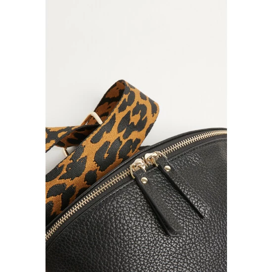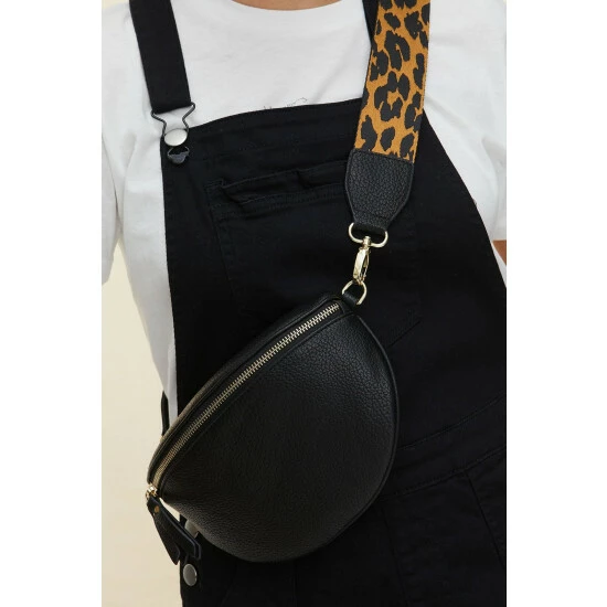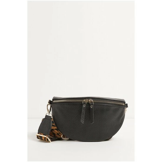 Keep your hands free with this curved belt bag, made in a black tone with gold metal hardware, a zipped main compartment and detachable leopard-print strap.