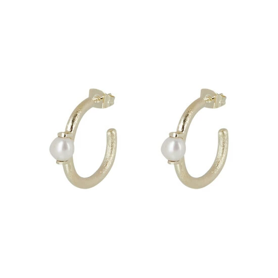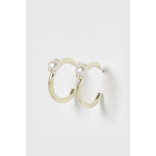 On textured gold toned hoops, these earrings feature a circular pearl bead in the middle and are suspended from stud backs.