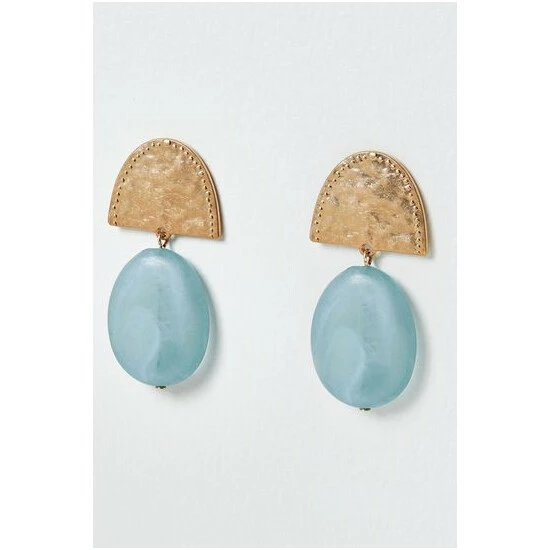 These drop earrings feature a blue drop stone hanging below a gold-toned semi-circular disc with a hammered finish, complete with stud backs.