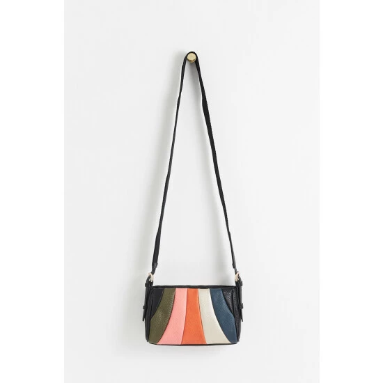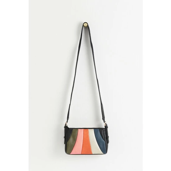 In a curved silhouette, this cross-body bag features a striped design for a pop of colour against the overall black tone. With adjustable buckle fastenings in a gold tone, this cute yet compact bag is complete with a comfortable fabric strap.