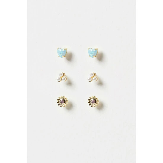 Oliver Bonas Blue Ula Flower Pearl And Heart Gold Plated Stud Earrings Pack Of Three
