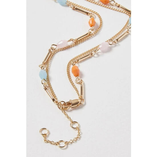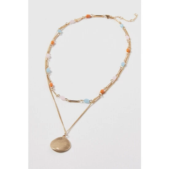 In a double row design, this gold toned necklace features a chunky beaded chain against a dainty curb chain, anchored by a matte disc charm.