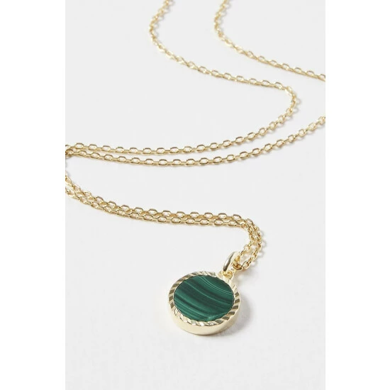 A green marbled stone disc sits in the centre of a gold-tone setting and hangs from an adjustable chain.