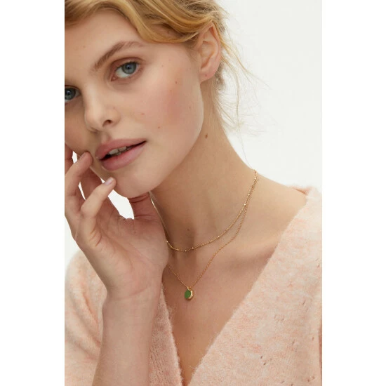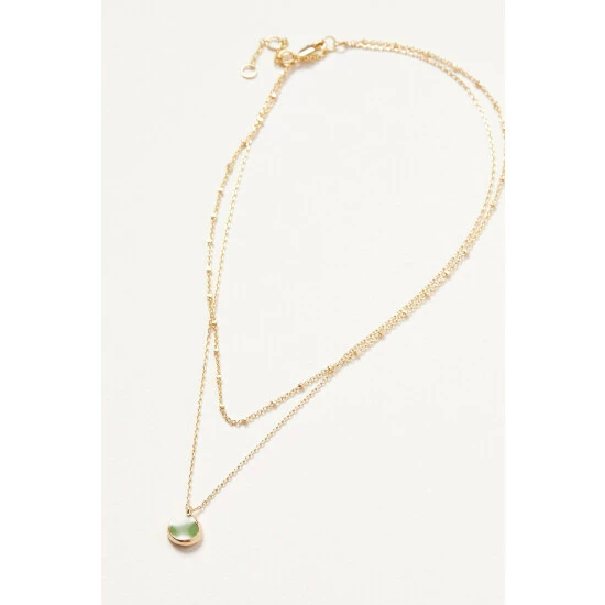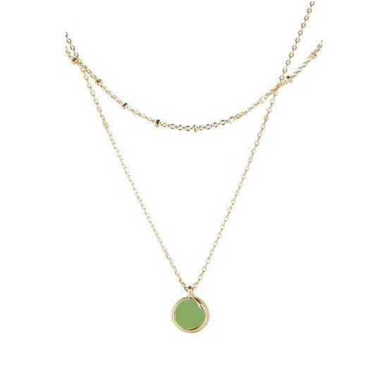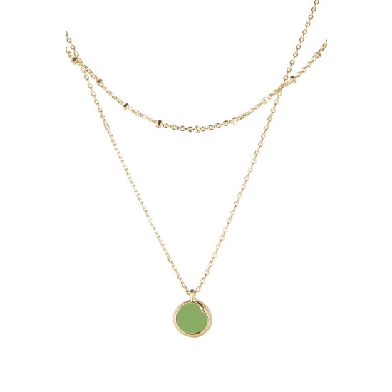 On a layered gold-toned beaded chain, a simple green disc is surrounded with a gold-toned lining and hangs from an adjustable chain with lobster clasp.