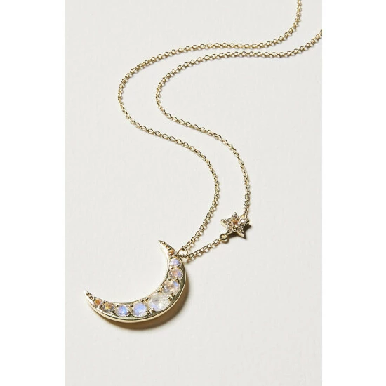 Sparkle like the night sky with this statement pendant necklace. Featuring a large crescent moon charm adorned with iridescent stones, suspended from an extendable gold toned chain sporting a dainty star design, and completed with a lobster clasp.