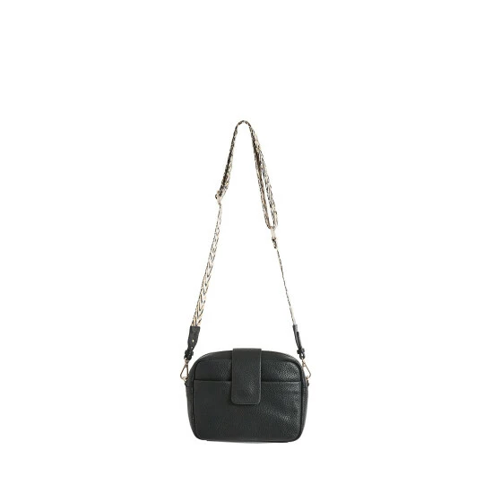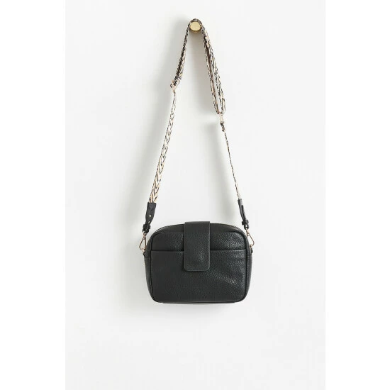 In a rectangular profile, this black crossbody bag contains one lined main compartment and one zipped inner pocket, with an outer slip pocket for your essentials. Featuring a contrasting animal print woven detachable crossbody strap in black, white and gold tones with gold-toned hardware, this bag is completed with a zip fastening and a fold-over flap.