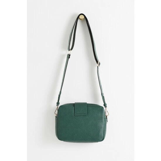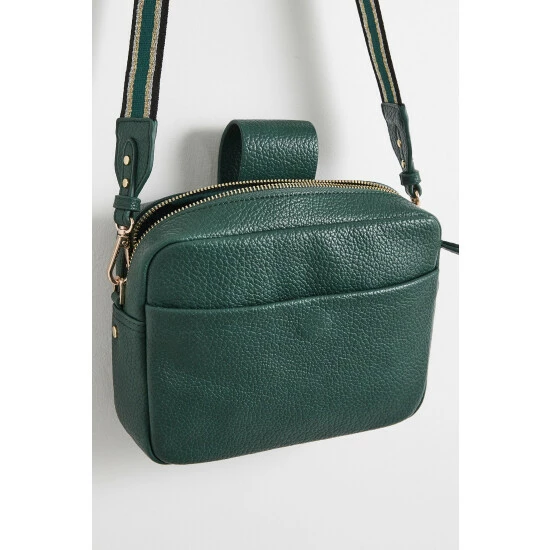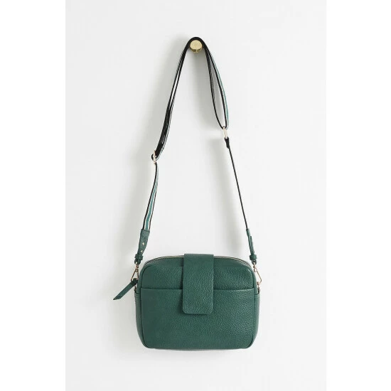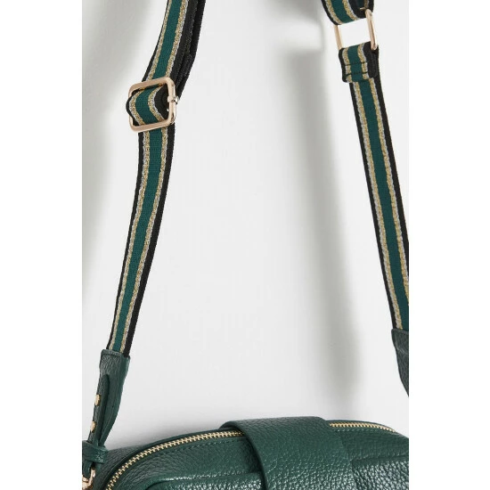 In a rectangular profile, this green cross-body bag contains one lined main compartment and one zipped inner pocket, with an outer slip pocket for your essentials. Featuring a contrasting woven detachable cross-body strap in black, green and metallic tones with gold-toned hardware, this bag is completed with a zip fastening and a fold over flap.