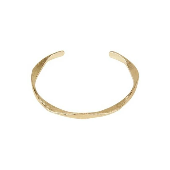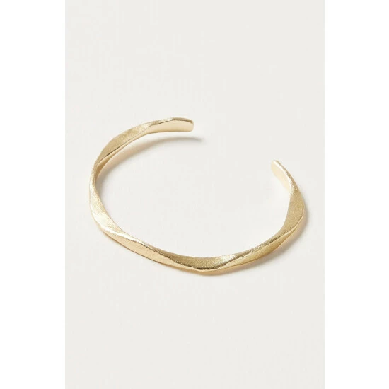 This gold-plated open cuff bangle features a twisted structure with an organic textured finish.