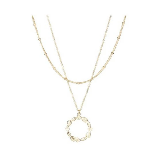 This layered necklace features two gold-plated chains with a hoop pendant, complete with an extendable chain and a lobster clasp.