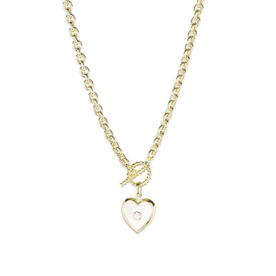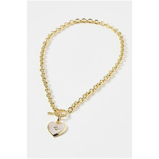 This gold-plated chunky chain necklace features a heart pendant with a mother of pearl inlay, detailed with a silver jewel placed in the centre and complete with a bar and ring clasp.