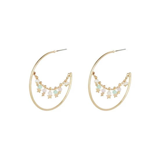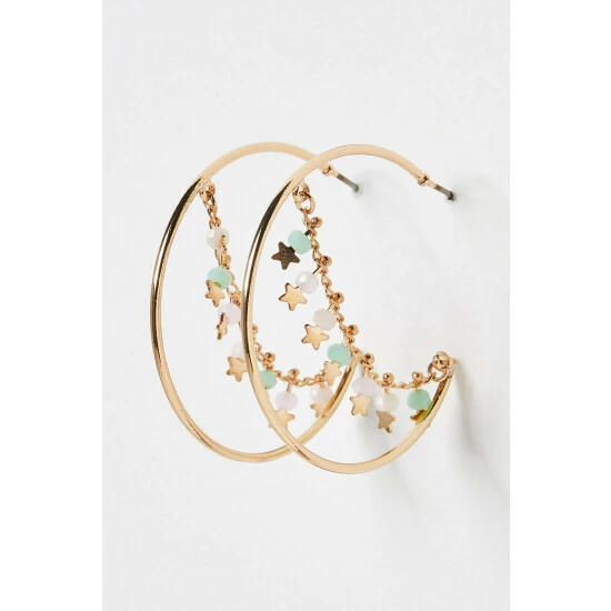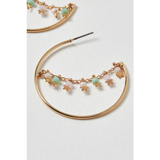 This pair of gold-plated hoop earrings feature a gold chain with pastel toned beads and golden stars hanging across the diameter, complete with stud backs.