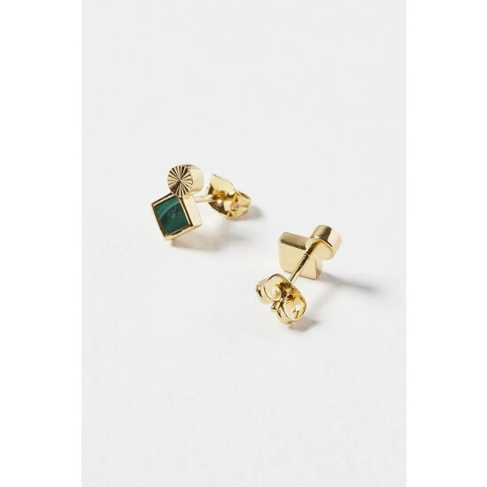 Oliver Bonas Green Corliss Square Stone And Engraved Disc Stud Malachite, Gold Plated Brass Earrings