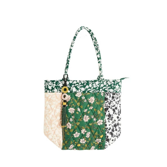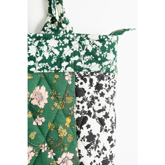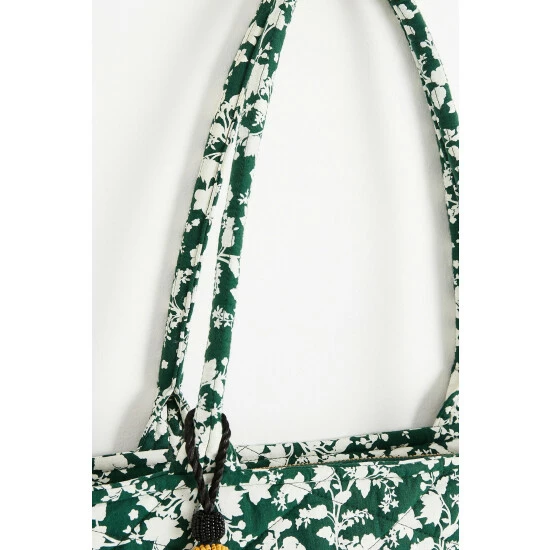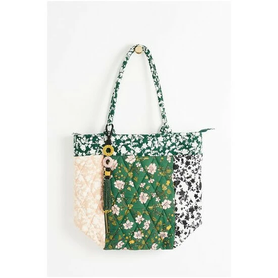 Bring a tactile touch to your accessories with this quilted tote bag. Featuring floral print paneling in green and pink tones, this boho-vibe bag has a beaded and tassel embellishment and a zipped main compartment.