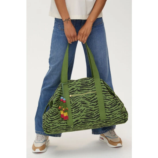 In an on-trend green tone with black animal print, this spacious weekend back has one large compartment with two small inner pockets for your essentials. A colourful tassel accessory sits to the side of the zipped outer pocket, with shoulder straps above for when you are on the go.