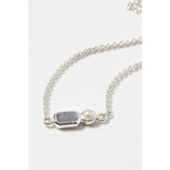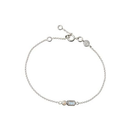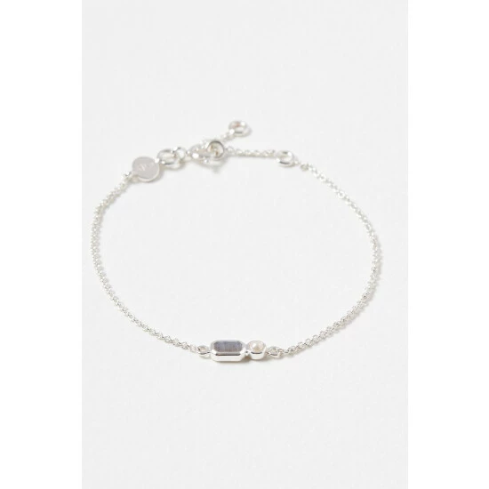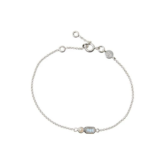 A semi-precious stone inlay and white pearl duo sit side by side on a silver chain bracelet, with an adjustable length and lobster clasp fastening.