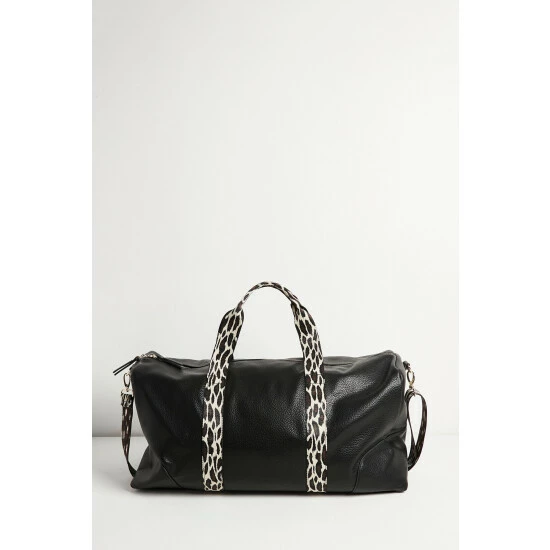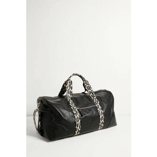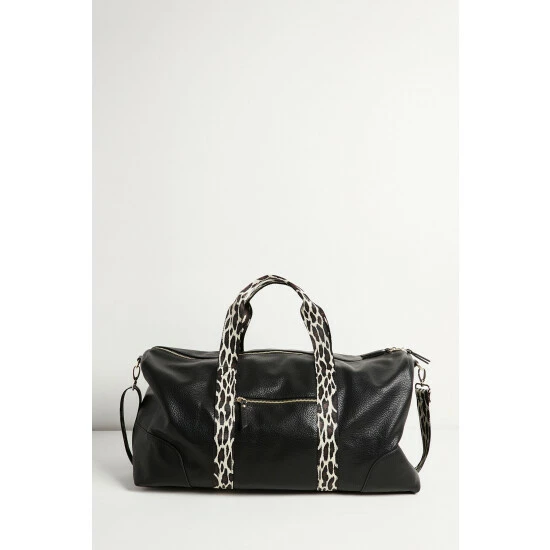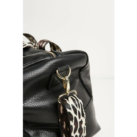 Pack everything you need for a weekend getaway in this large weekend bag. Made with PU, this black bag has a grab handle plus a removable cross-body strap in animal pattern. The weekend bag is complete with gold metalware and includes inner and outer zipped pockets to keep your smaller items secure.