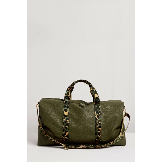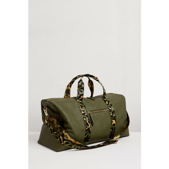 Pack everything you need for a weekend getaway in this large weekend bag. Made with PU, this khaki bag has a grab handle plus a removable cross-body strap in khaki and orange animal pattern. The weekend bag is complete with gold metalware and includes inner and outer zipped pockets to keep your smaller items secure.