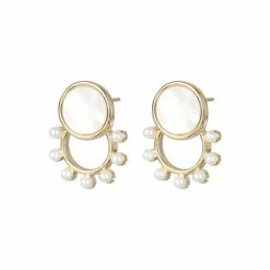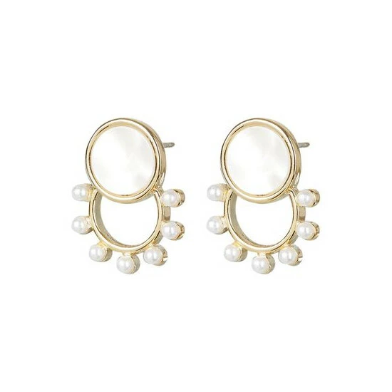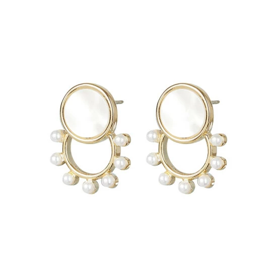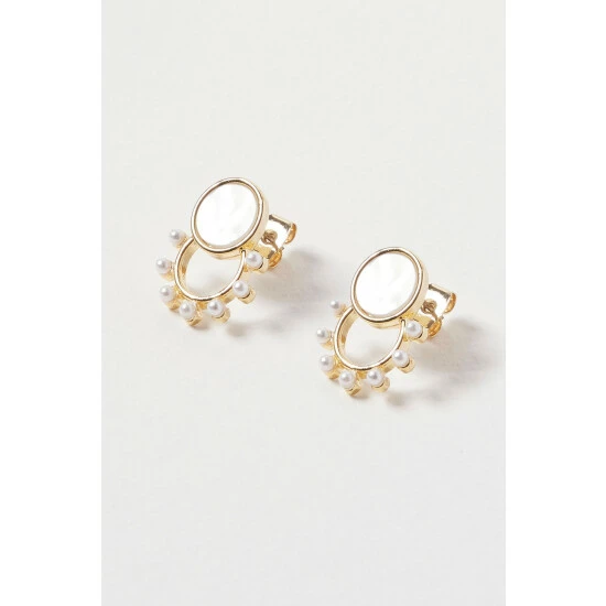 In an overlapped structure this pair of studs features a gold toned circular disc with a pearlescent inlay placed above a gold circular hoop with pearl beading, complete with stud backs.