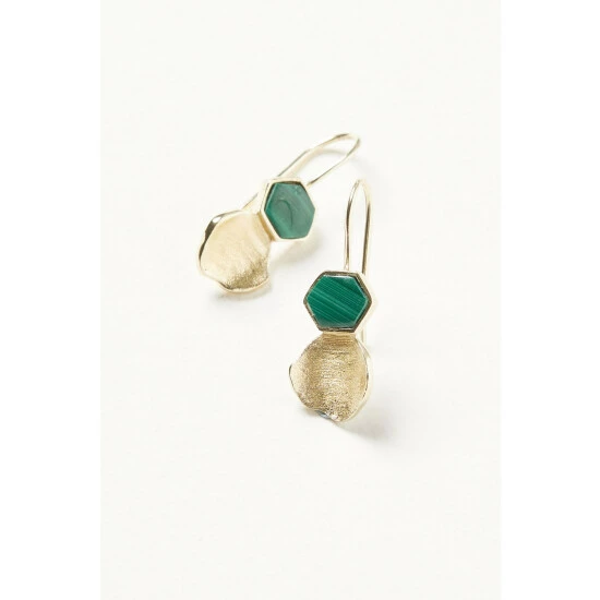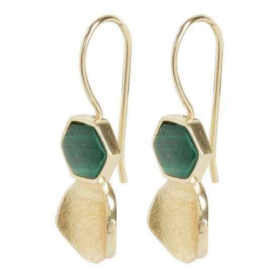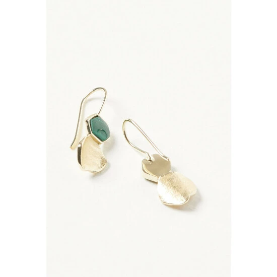 In an elegant double drop, these statement earrings feature semi-precious green stones atop a hammered metal drop and are finished in a golden setting.
