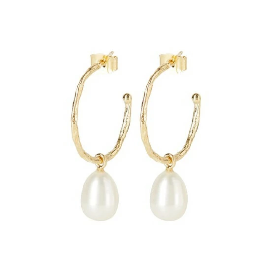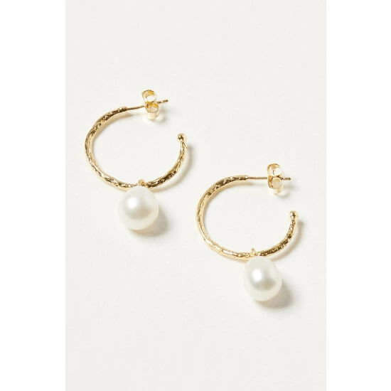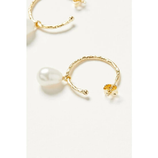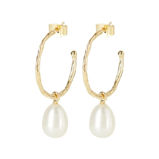 Effortlessly elegant, these gold toned hoop earrings are finished in a hammered metal texture and anchored by pearl charms.