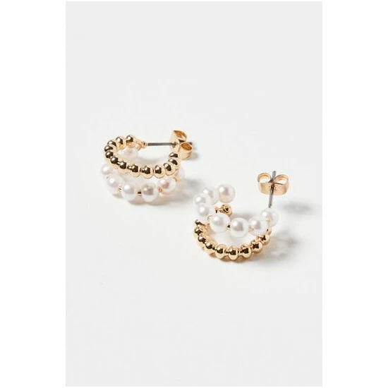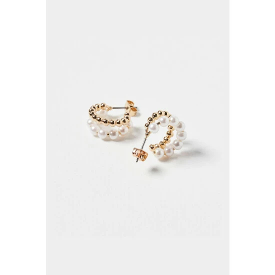 For a layered look, opt for these hoop earrings featuring a beaded gold toned row against elegant faux pearls, complete with stud backs.