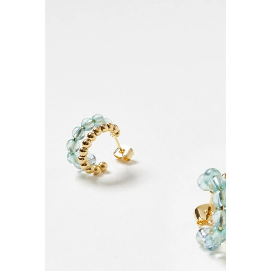 In a double row, blue beads curve alongside gold-toned metal beads on hoop earrings. Perfect for adding some colour to your look.