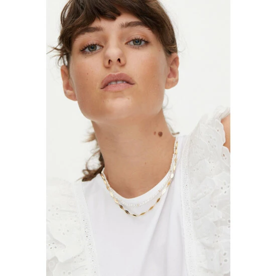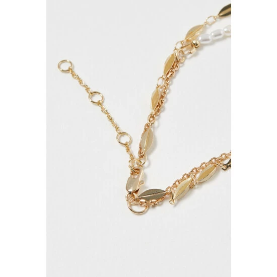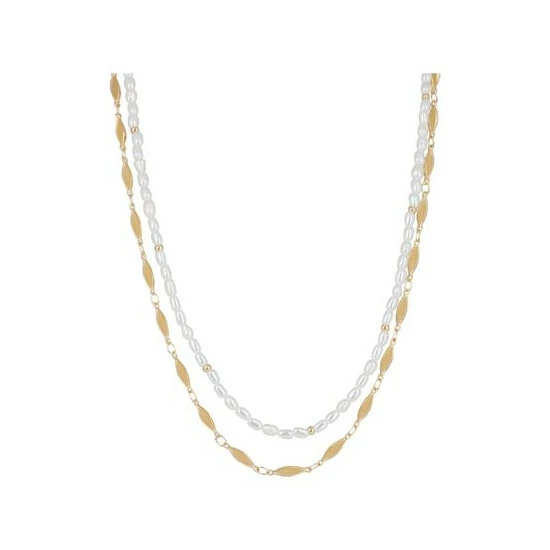 In a double row design, this layered necklace features a glossy gold toned link chain against a beaded faux pearl chain, complete with an extendable length and lobster clasp fastening.
