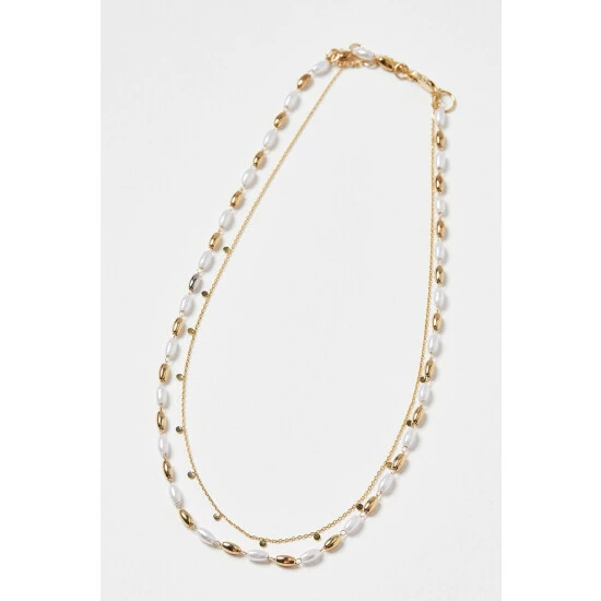 This layered chain necklace features a fine gold-toned chain detailed with small discs, paired with a pearlescent and golden beaded chain, complete with an adjustable chain and a lobster clasp.