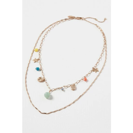 This gold-toned chain necklace features a gold pendant with amethyst details, complete with a hook through clasp.