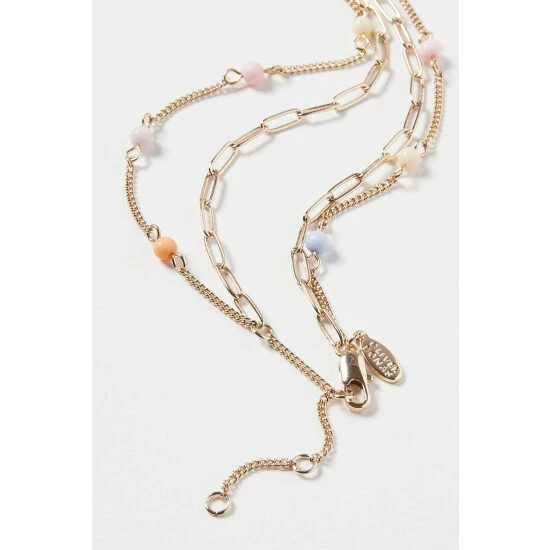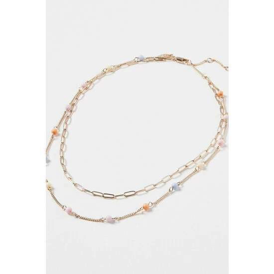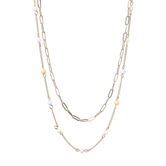 This gold-toned layered necklace features a chunky chain paired with a fine chain, detailed with pastel toned bead details, complete with an adjustable chain and a lobster clasp.