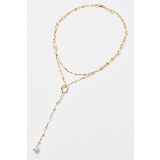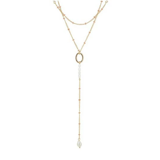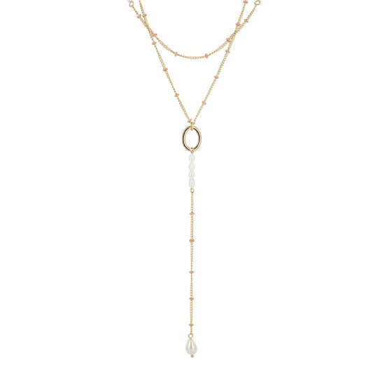 This gold-toned layered chain necklace is detailed with pink enamel rings and pearl beading, complete with an extendable chain and a lobster clasp.