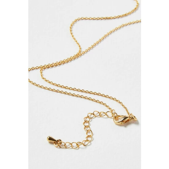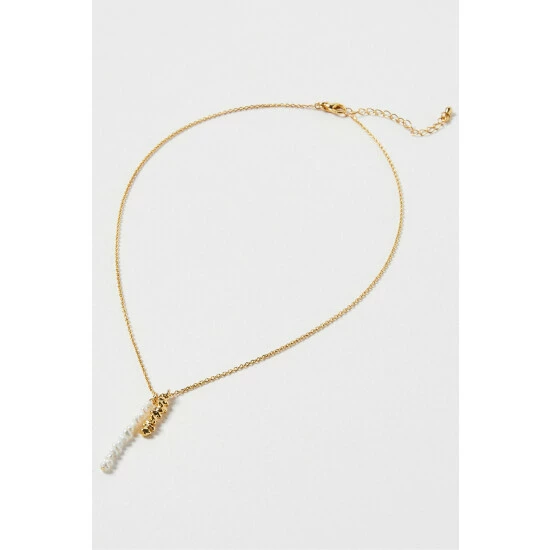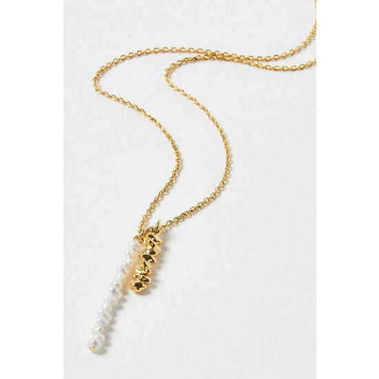 This gold-toned necklace features a metallic gold nugget and pearl pendant, complete with an adjustable chain and a lobster clasp.