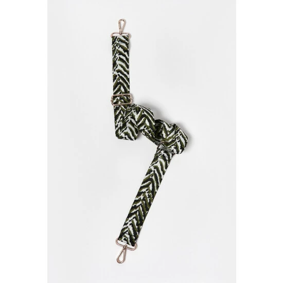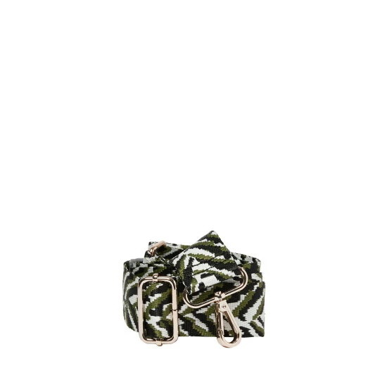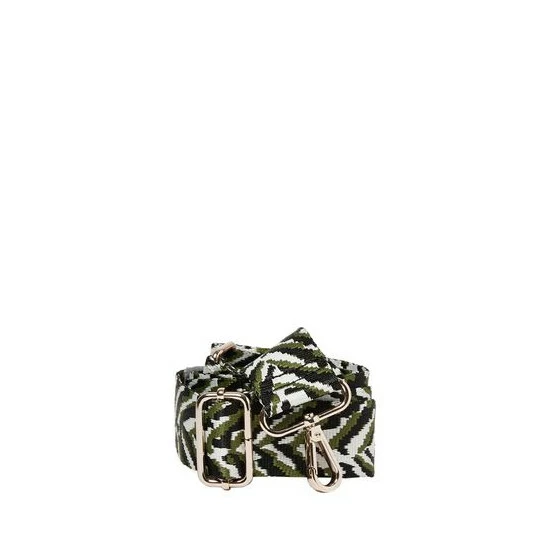 With stripes of green, white and black, this zebra print bag strap has gold-toned metalware and an adjustable design.