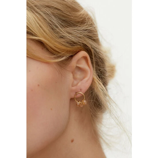 A cluster of pink toned glass beads huddle together along a gold-toned loop. Sitting on stud backs, these earrings are fun and youthful.