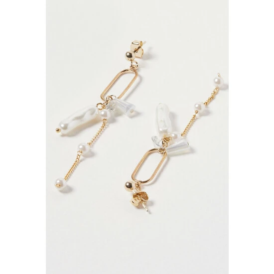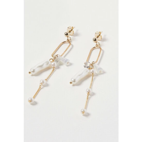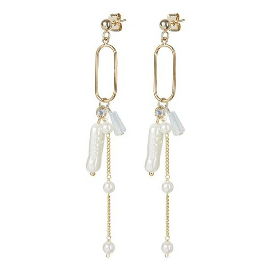 Add a dainty touch to your lobes with the Rhea Long Pearls and Beads Drop Earrings. Featuring ovals drops with pearl charms interlinked onto a fine charm, complete with stud backs.