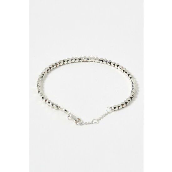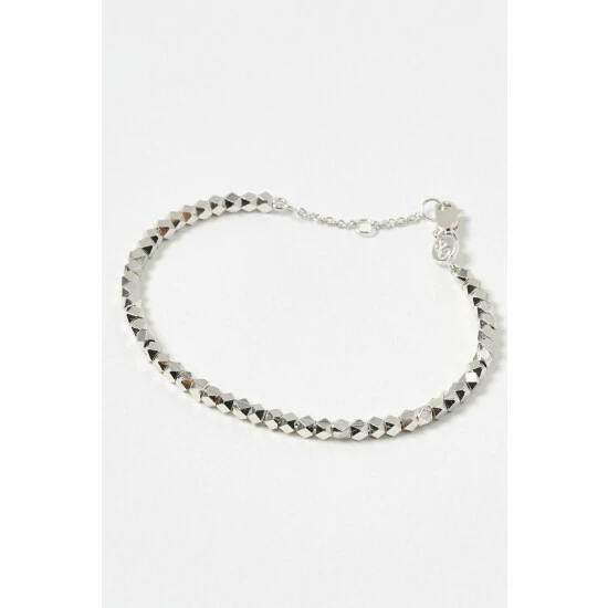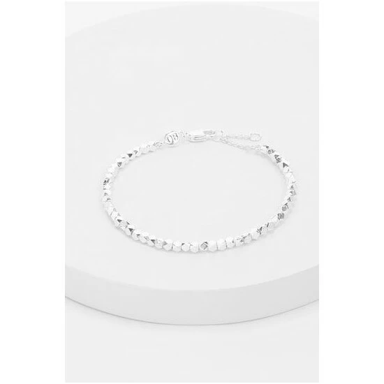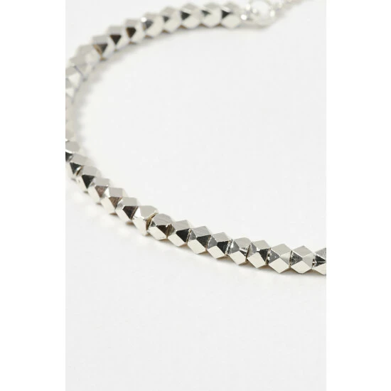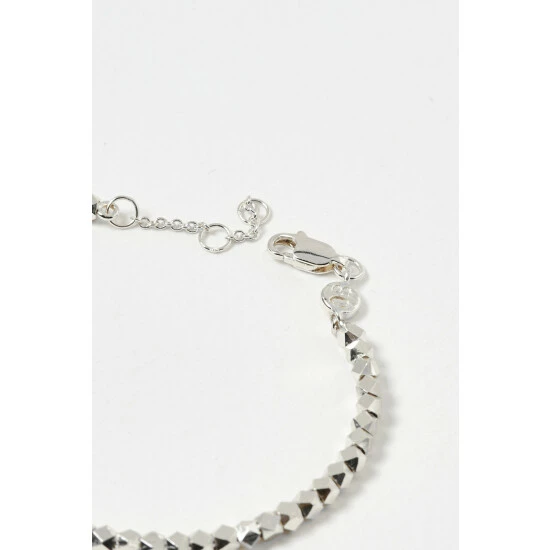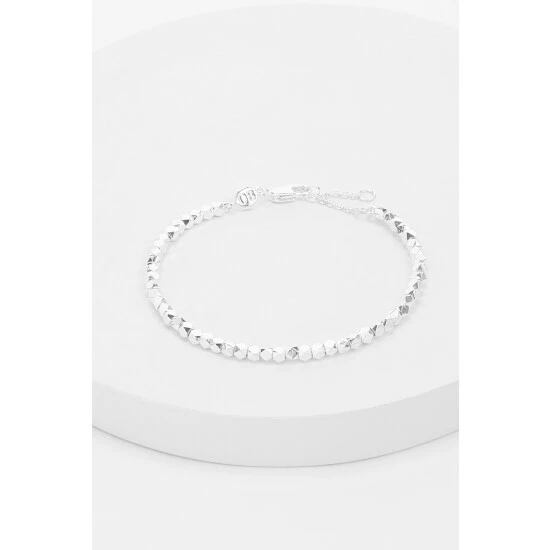 This silver-plated chain bracelet features a row of beads, complete with an extendable chain and a lobster clasp.