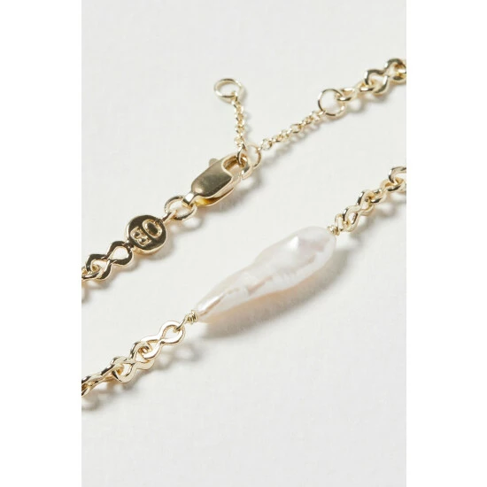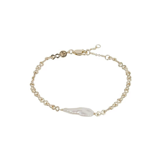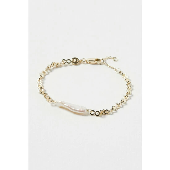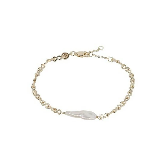 This gold-toned chain bracelet features a long pearl centring a wiggly chain, complete with an extendable chain and a lobster clasp.