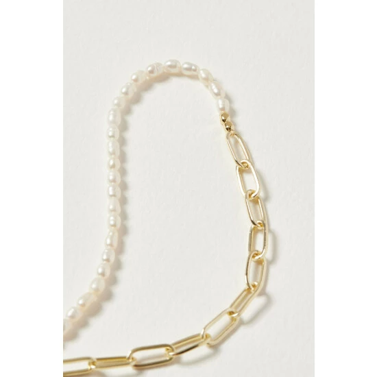 Oliver Bonas Womens White Odina Half Chain & Pearl Fob Clasp Gold Plated Brass Collar Necklace
